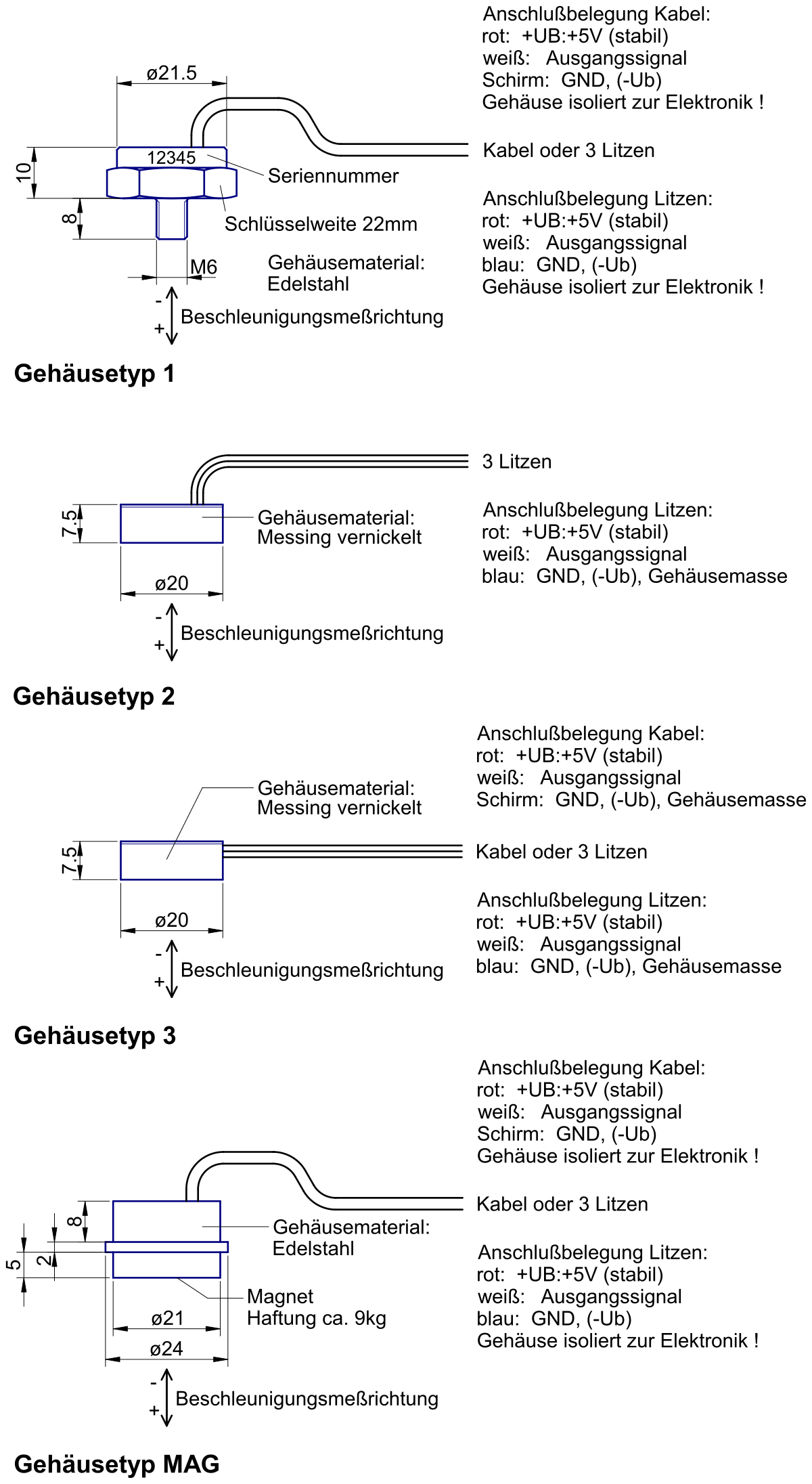 | Empfindlichkeit bei Ub = 5 Volt | ca. 150mV/g | ca. 60mV/g | ca. 15mV/g |