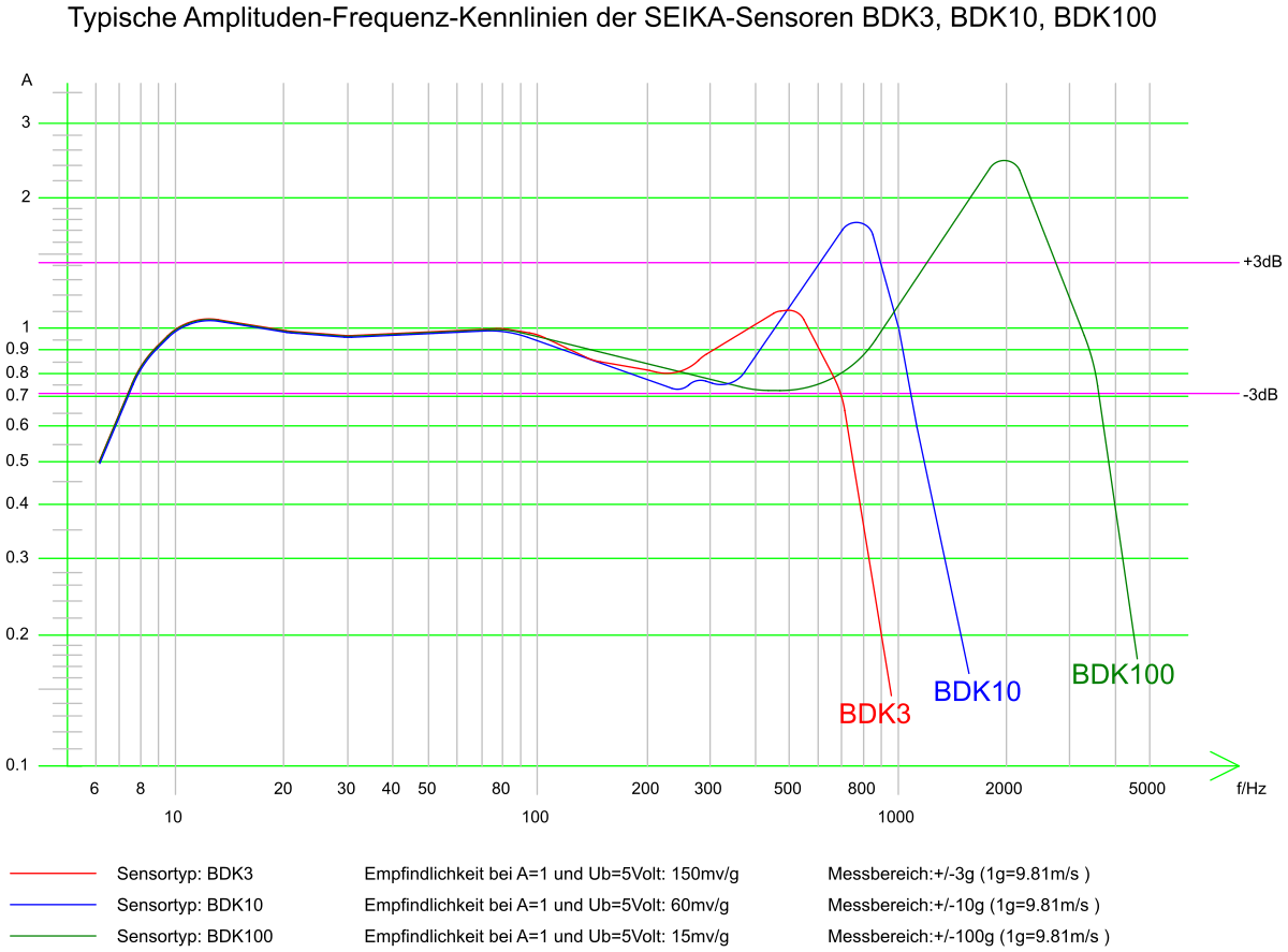 Die dynamischen Beschleunigungssensoren BDK3, BDK10, BDK100 sind kapazitiv wirkende Feder-Masse-Beschleunigungssensoren mit integrierter Sensorelektronik. Resonanzüberhöhungen werden durch eine spezielle gasdynamische Dämpfung im Primärwandler vermieden bzw. verringert.
