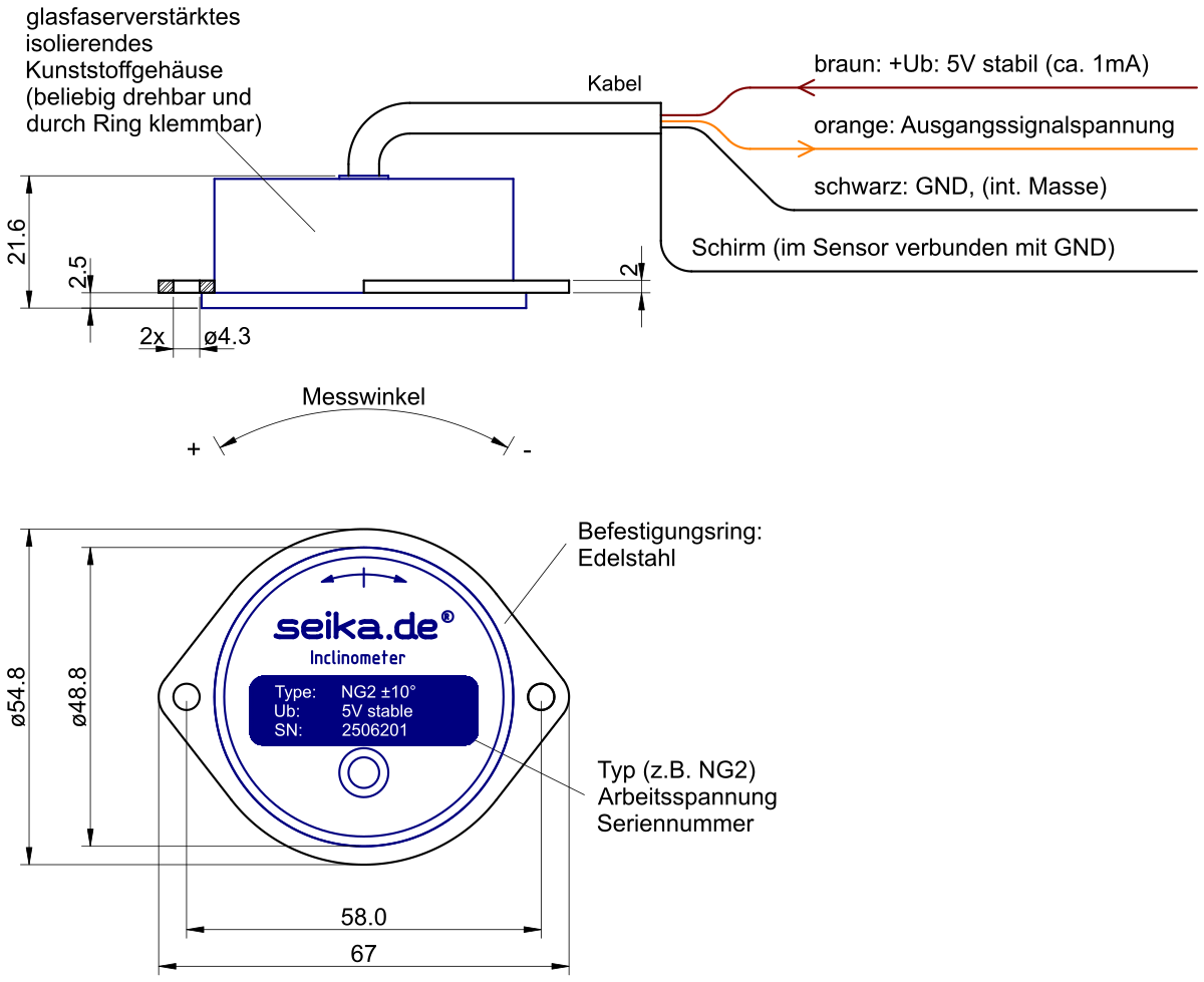 Die Neigungssensoren NG2, NG3 und NG4 sind kapazitiv wirkende Flüssigkeitsneigungssensoren mit integrierter Sensorelektronik. Die Sensoren werden mit einem analogen Spannungsausgang und optional mit einem tastverhältnismodulierten PWM-Impulsspannungsausgang gefertigt. Die Sensorelektronik benötigt nur eine geringe Hilfsenergie und zeichnet sich in Verbindung mit dem kapazitiven Primärwandler durch geringe Fehler und eine hohe Langzeitkonstanz aus. Das Messprinzip ermöglicht einen systembedingten linearen Zusammenhang zwischen dem zu messenden Neigungswinkel und dem Ausgangssignal. Der ermittelte Messwert ist unabhängig von der Größe der Erdbeschleunigung am Messort, d.h. egal wo man sich befindet, ob in Europa, in Australien, auf dem Mount Everest oder auf dem Mond, der Neigungswinkel wird überall korrekt gemessen.