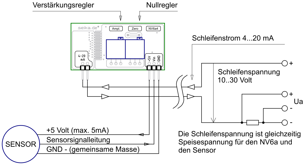 Der NV6a dient der Verstärkung, Filterung und Normierung der Sensorausgangssignale von SEIKA-Sensoren. Das Ausgangssignal gestattet eine problemlose Signalweiterverarbeitung auf der Basis der 4...20 mA-Stromschleifentechnik. Der NV6a benötigt keine zusätzliche Versorgungsspannung, da die intern erforderliche Arbeitsspannung aus der Stromschleife gewonnen wird. Der NV6a stellt außerdem eine hochstabile 5-Voltspannung mit Kurzschlussstrombegrenzung als Sensorbetriebsspannung bereit. Vielfältige interne Beschaltungsvarianten gestatten eine optimale Anpassung der Signalverarbeitung bezüglich Einschwingzeit, Filtergrenzfrequenzen, Verstärkungs- und Nullpunkteinstellung an die zu lösende Messaufgabe.