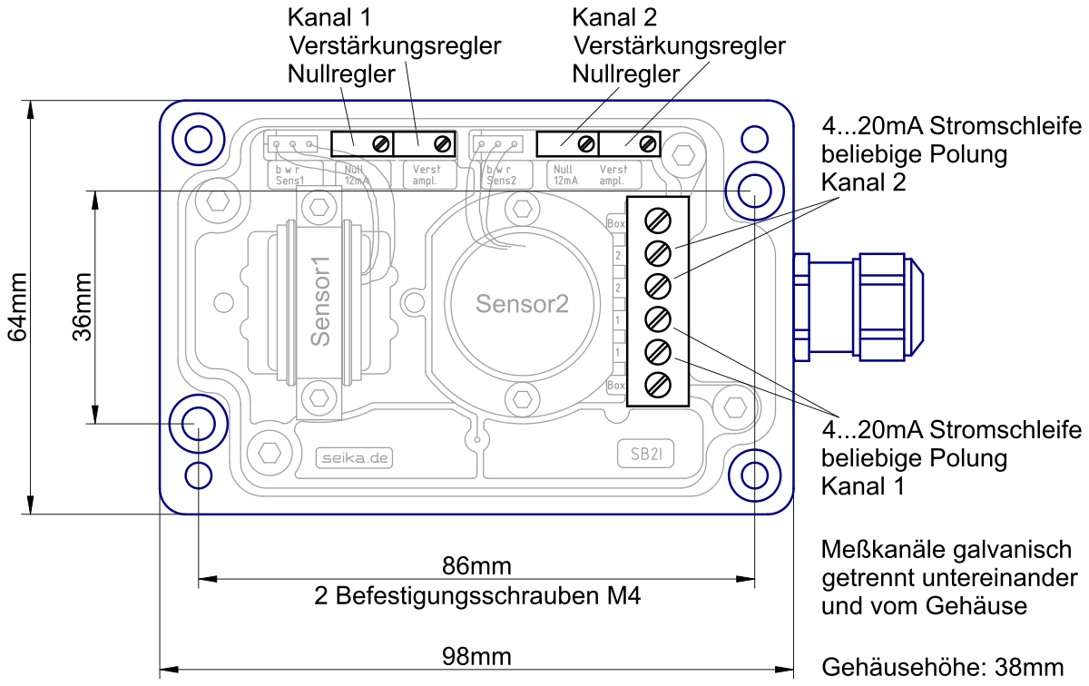 - Sensoren und Stromnormierverstärker sind galvanisch vom Gehäuse getrennt