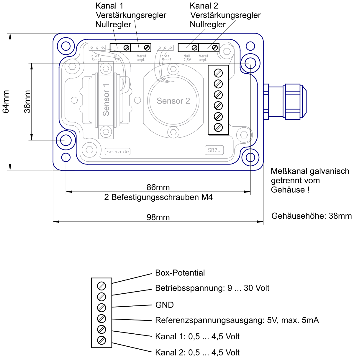 - Sensoren und Spannungsnormierverstärker sind galvanisch vom Gehäuse getrennt