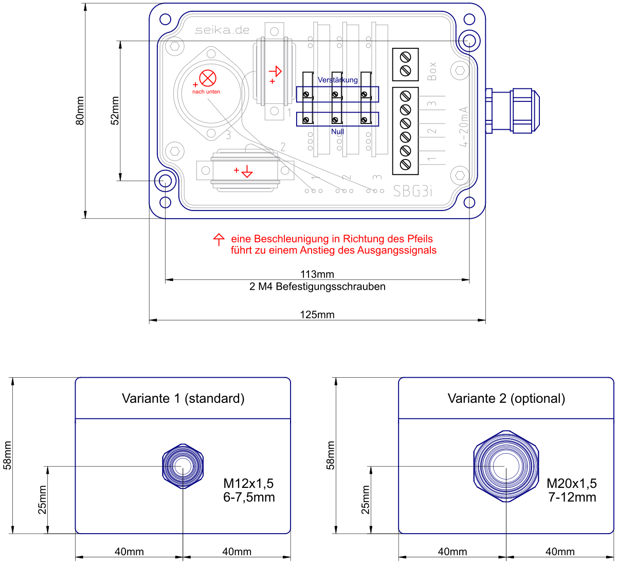 Sensorbox mit drei SEIKA-Sensoren und drei Stromnormierverstärkern mit 4 … 20mA Signalausgang. Alle drei Kanäle sind galvanisch voneinander getrennt.