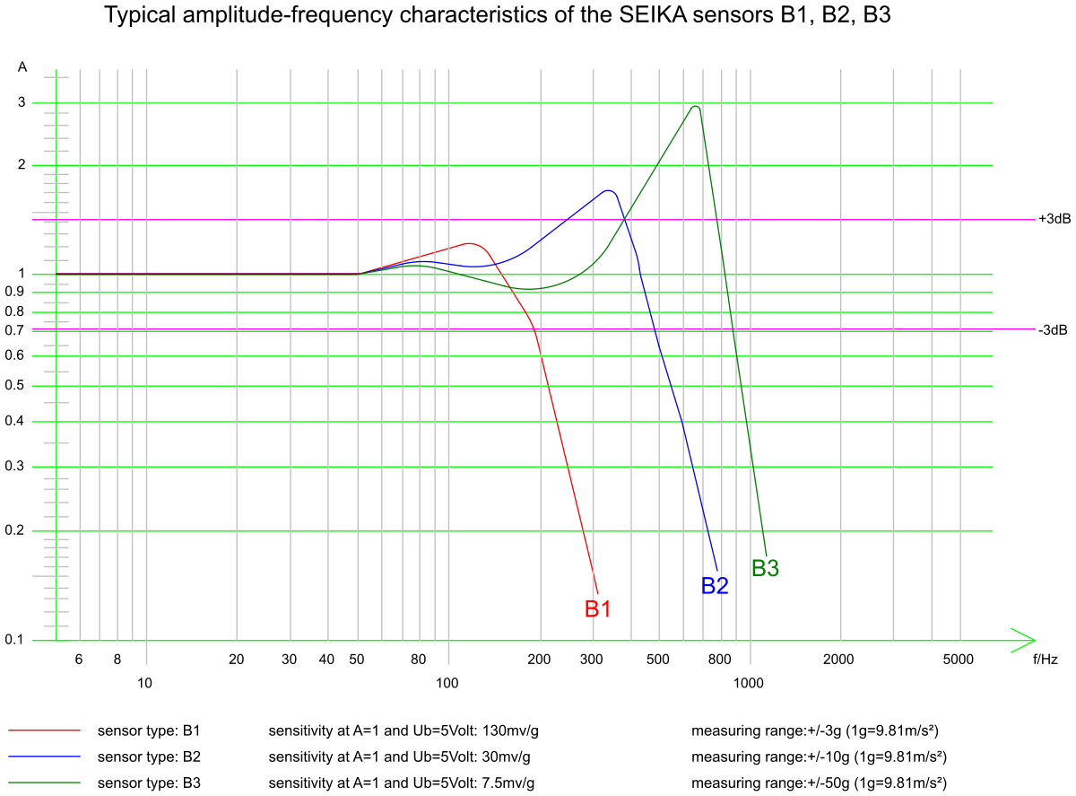 The sensors B1, B2 and B3 are capacitive spring-mass accelerometers with integrated electronics. Resonant peaks are minimized by special gas-dynamic damping in the primary transformer.