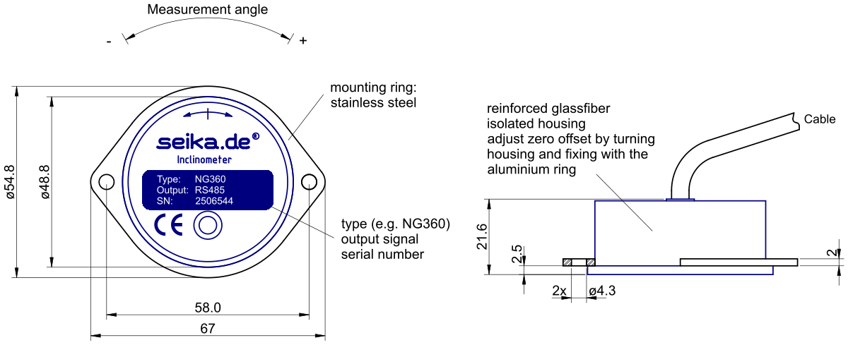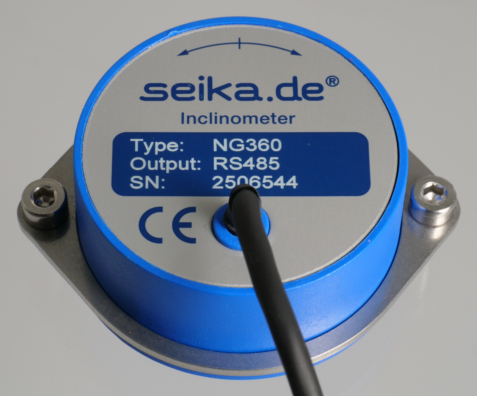 The NG360 is a capacitive, liquid based inclinometer with integrated sensor electronics and 16 bit microprocessor. The measurement result is transmitted via a RS485 port for further processing. Up to 78 sensors can be operated using a single communications line. The measurement method provides a linear relationship between the angle to be measured and the output signal. The determined angle is independent of the local gravitational acceleration, that means that no matter where the measurement is being taken, whether in Europe, Australia, on Mount Everest or on the moon, the inclination will be measured correctly anywhere. Temperature related inaccuracies are corrected by the integrated microprocessor.