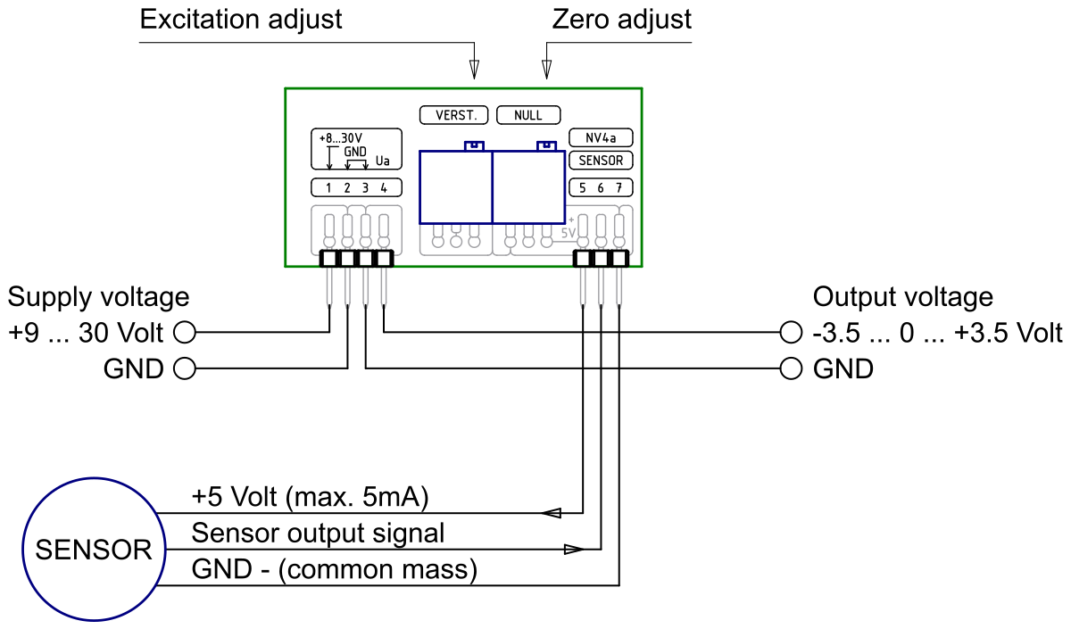 The NV4a has its application anywhere a SEIKA sensor is, without much expenditure and under optimal compatibility, to be connected to application specific measuring equipment with optimal matching conditions, and where subsequent adjustments to amplification and zero voltage are necessary.
