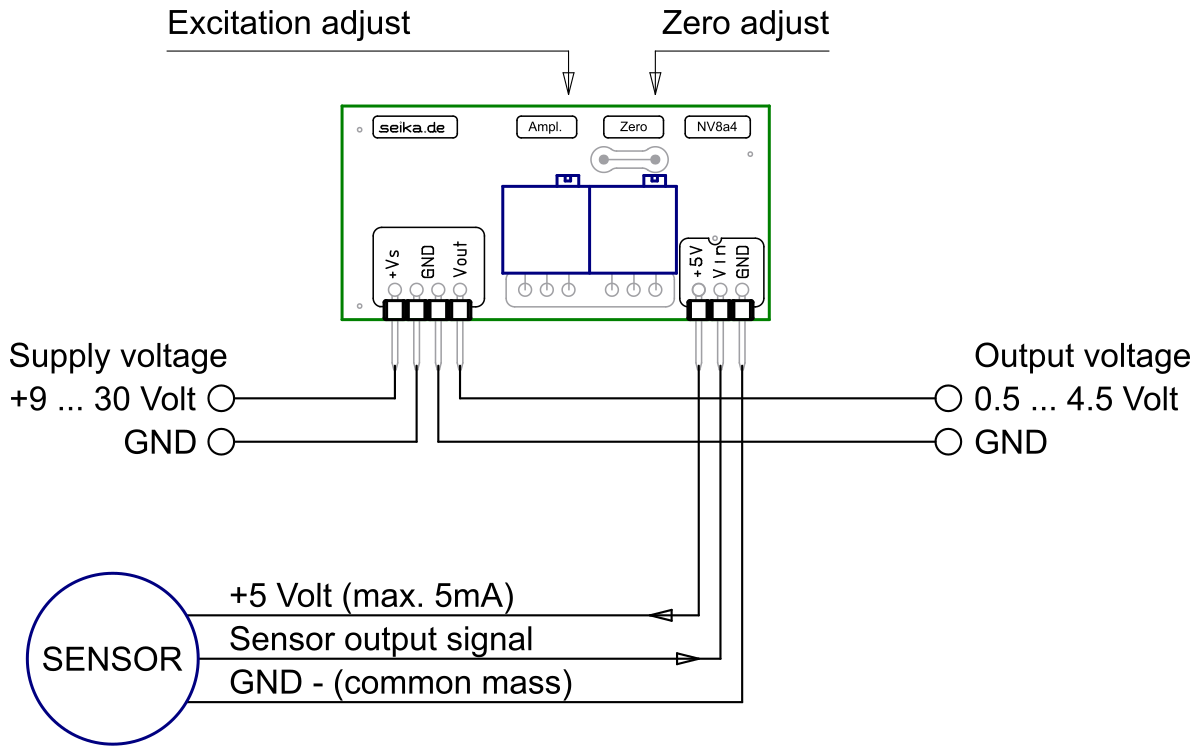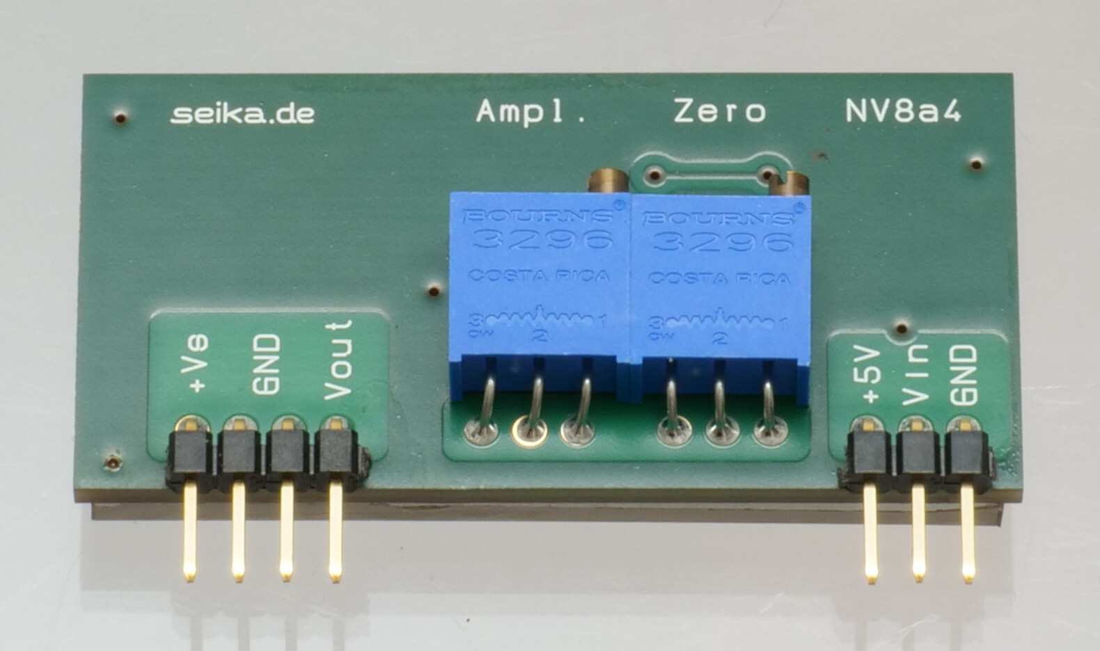 The NV8a has its application anywhere a SEIKA sensor is, without great expenditures and under optimal compatibility, to be connected to application specific measuring equipment and subsequent adjustment of amplification and zero position are necessary. The use of an asymmetric output voltage requires minimal electronics for further signal processing.