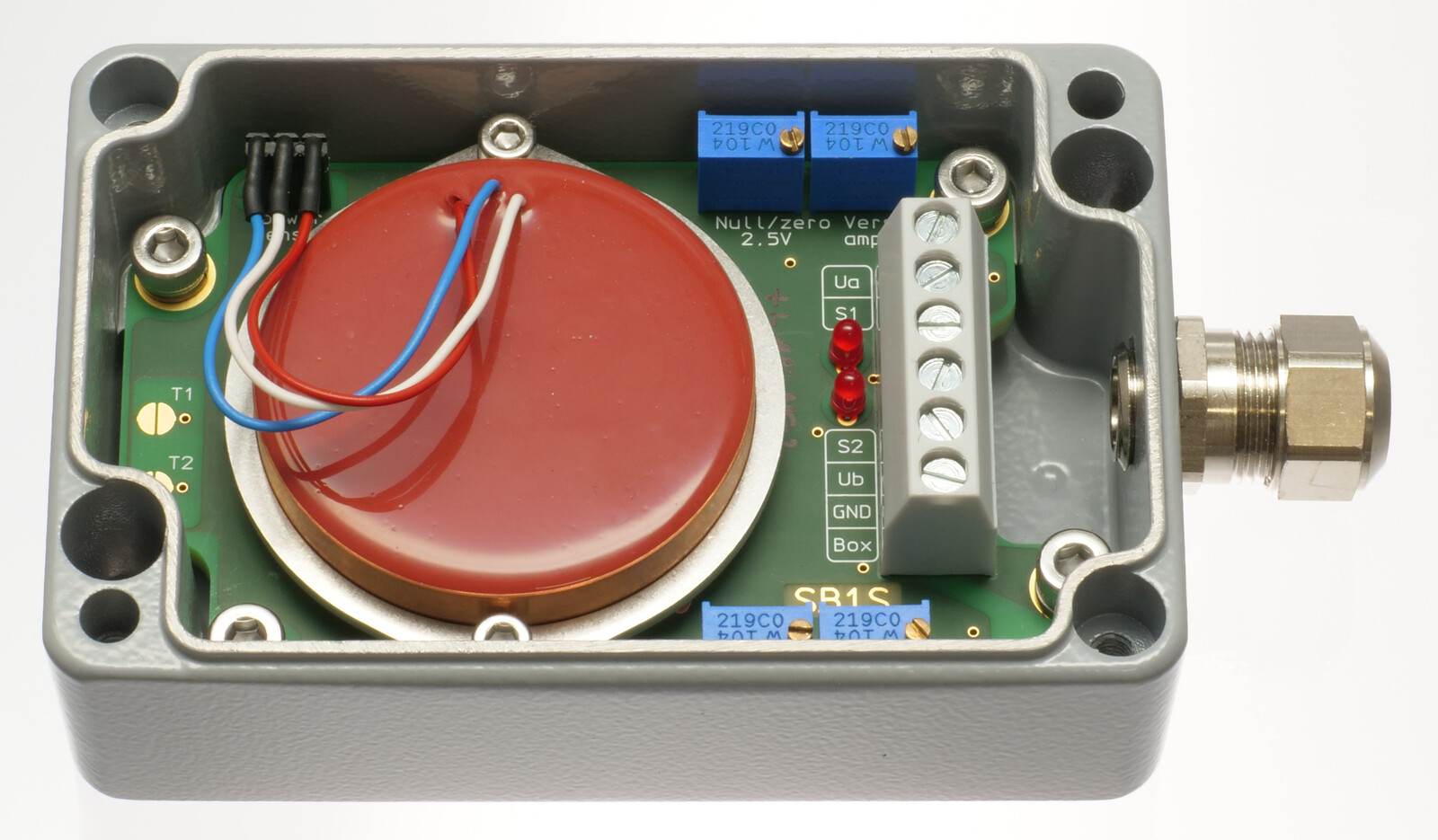 As well as the sensor, the box contains a signal conditioner with a 0.5 ... 4.5 Volt output and a separate, highly stable supply voltage that can be used externally as a reference point. Furthermore, the signal conditioner includes an active low pass filter, whole upper cut-off frequency / settling time can be tailored to suit the measurement task, and a noise voltage filter to guarantee the EMC. Interference signals caused by unwanted ground currents are eliminated by electrically isolating sensor and signal conditioner from the housing. In addition to the voltage output, the SB1S has two open-collector output switches. Two helical trim-potentiometers enable the adjusting of two trigger thresholds within the measuring range, the exceeding of which causes the corresponding output switch to trigger. Optionally, the state transition can be set to be either off to on or on to off. The switching hysteresis can be adapted to the measuring task. Unlike the SB2.., the SB1S can accommodate larger inclinometers, such as the NG-series, that have a higher measuring accuracy. Electronic temperature compensation largely compensates for the temperature drift of the implemented sensor's sensitivity. Optionally, the temperature drift of both offset and sensitivity can be reduced significantly through individual compensation.