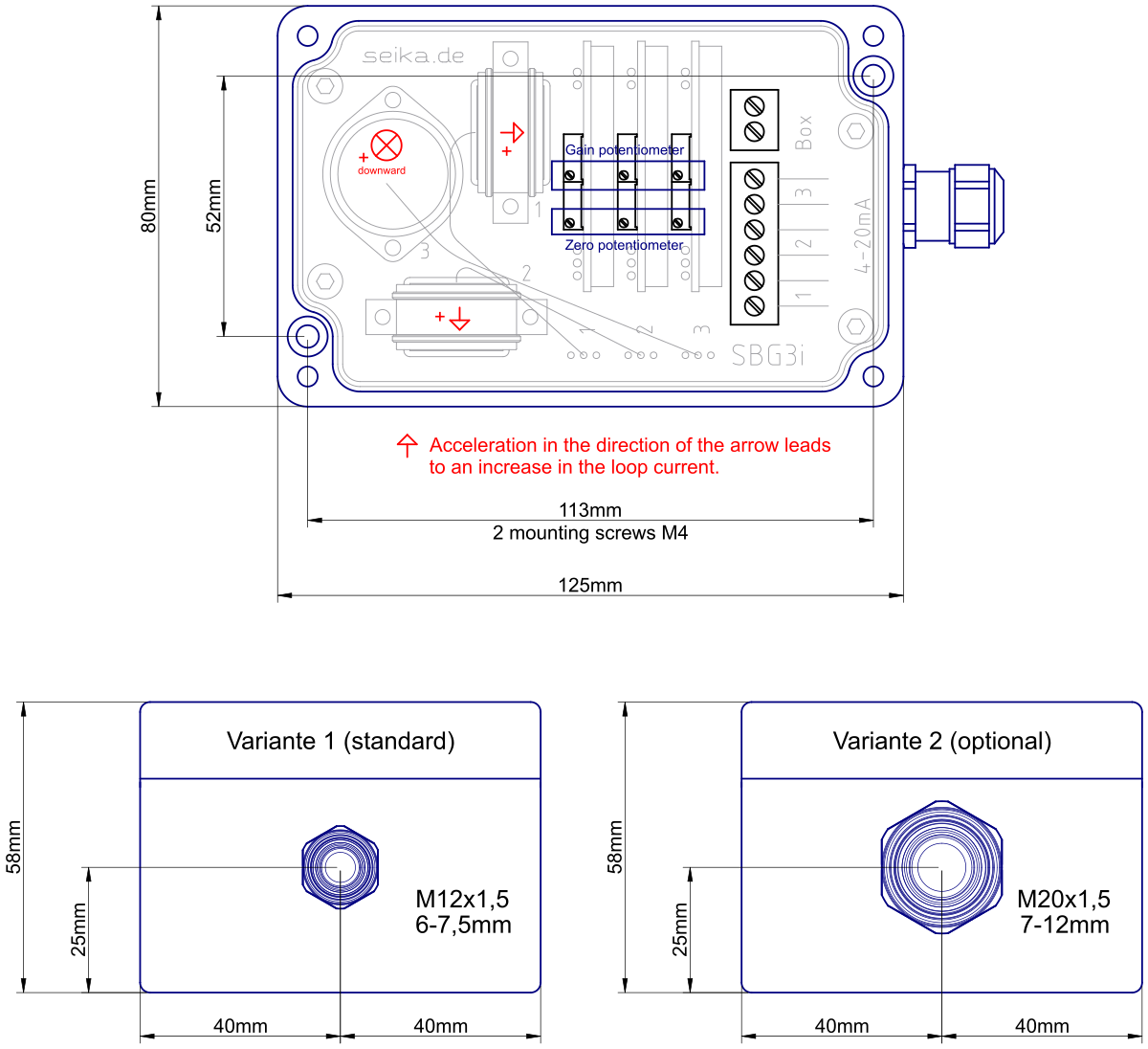 As well as the sensors, the box contains three independent signal conditioners, each with a 4...20mA, 2-wire output, and three separate, highly stable voltage supply feeding off the corresponding current loop, one for each sensor. Furthermore, each signal conditioner includes an active low pass filter, whose upper cut-off frequency / settling time can be adjusted to suit the measurement task, an output stage with current limitation, a noise voltage filter and a diode bridge for unipolar connection to the current loop. Interference signals caused by unwanted ground currents are eliminated by electrically isolating each sensor and signal conditioner from each other and the housing. A special electronic temperature compensation system can significantly reduce the temperature sensitivity of the implemented sensors. Electronic temperature compensation largely compensates for the temperature drift of the implemented sensors' sensitivity. Optionally, the temperature drift of both offset and sensitivity can be reduced significantly through individual compensation.