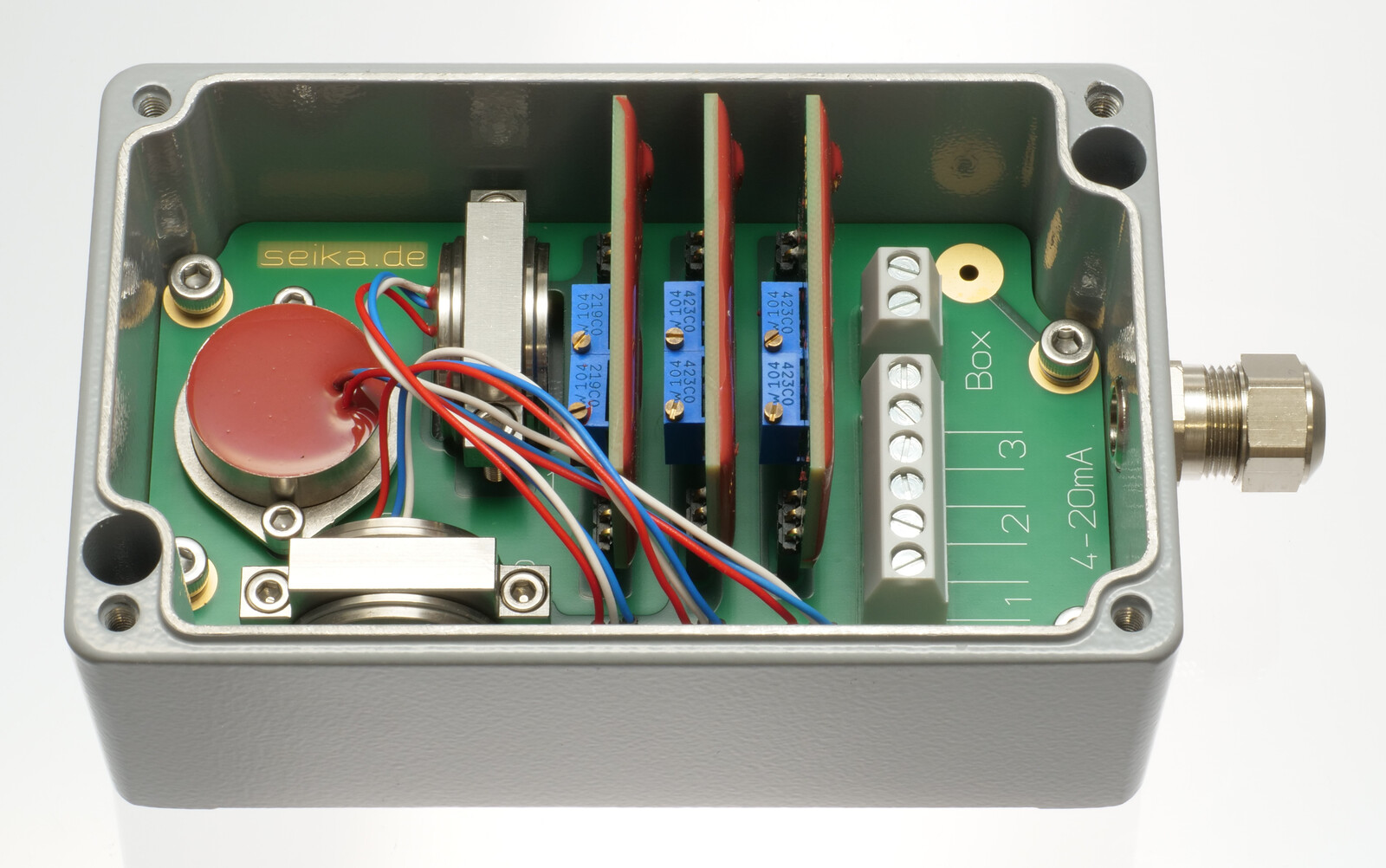 Sensorbox containing three SEIKA sensors and three signal conditioners with 4...20mA output. All three channels are galvanically separated from each other.