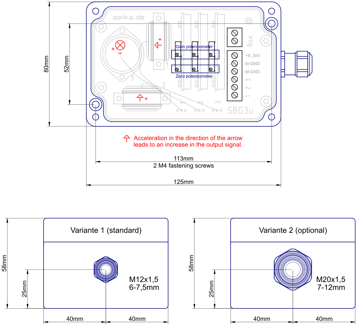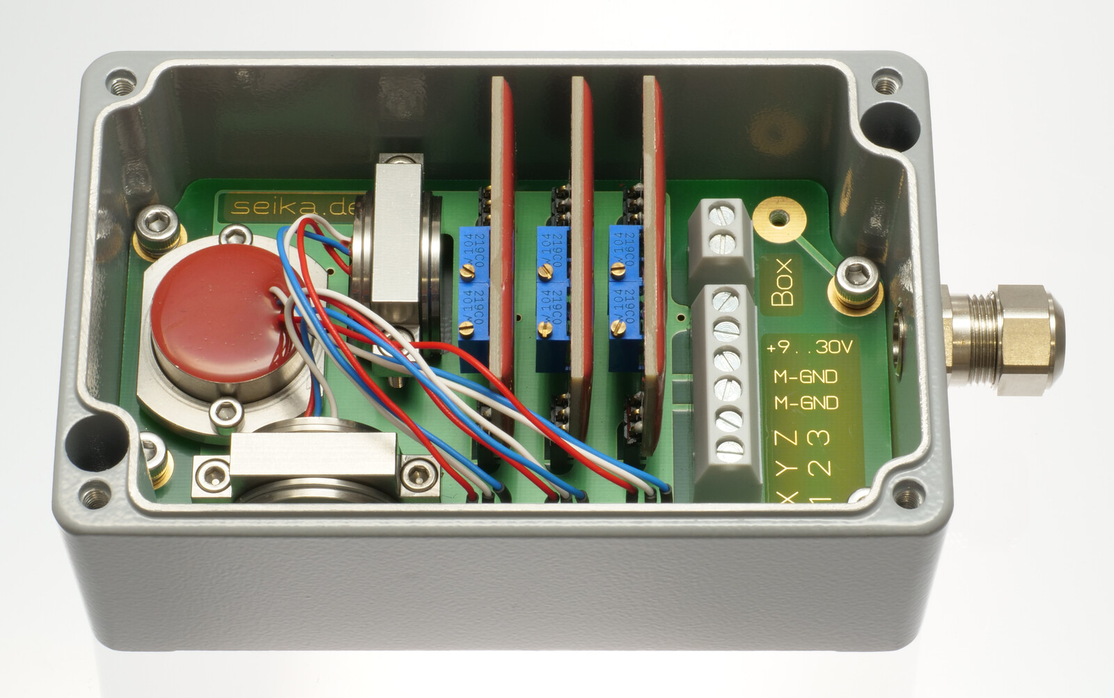 Sensorbox containing three SEIKA sensors and three signal conditioners with 0.5 ... 4.5 Volt or ±3.5 Volt output.