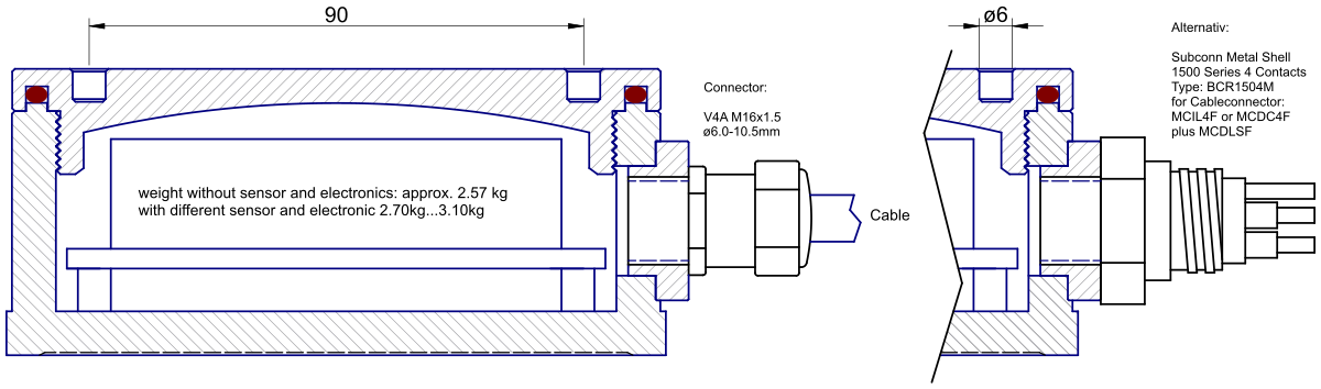 | Cable gland | M16 x 1.5 cable gland, clamping range 6mm...10.5mm (V4A stainless steel with integrated strain relief) optional: • Subconn® connector (can be plugged underwater) |