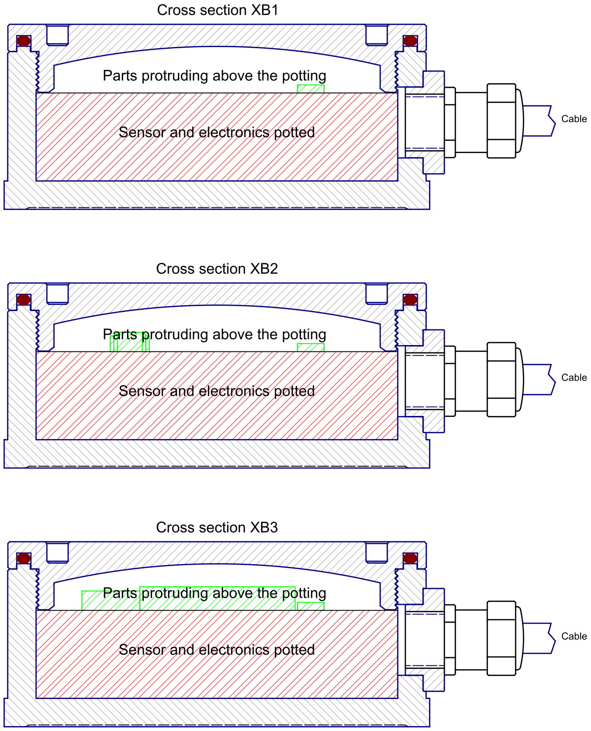 Cross sections of the ATEX type XB with 1, 2, and 3 sensors