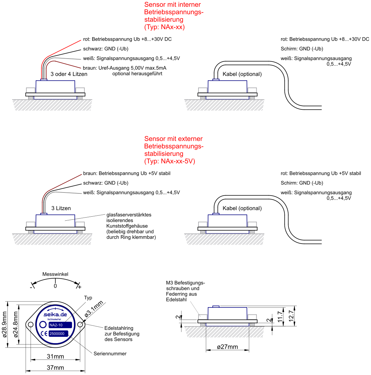 Die mit einer von SEIKA Mikrosystemtechnik GmbH entwickelten integrierten Sensorelektronik ausgestatteten, kapazitiv wirkenden Flüssigkeitsneigungssensoren NA2-05, NA2-10, NA3-30, NA4-45 und NA4-70 bestehen aus einem lasergetrimmten Spannungs-Normierverstärker mit elektronischer Kompensation der Temperaturdrift der Empfindlichkeit, einer hochstabilen Spannungs-Konstanthalteschaltung und einer Tiefpassfilterung zur Beseitigung unerwünschter Störsignale.