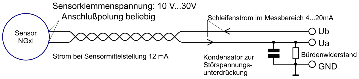 Ub,min = 10V + Spannungsabfall am Kabel + Spannungsabfall über die Bürde bei 20mA