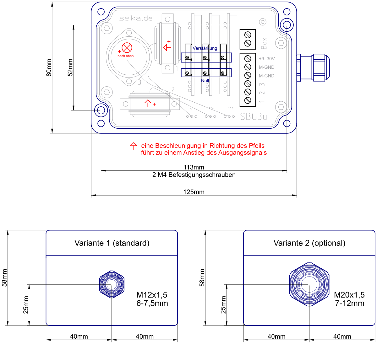 Zusätzlich enthält die Sensorbox drei voneinander unabhängige Spannungsnormierverstärker mit einem Ausgangssignal von 0,5V ... 4,5V oder (optional) ±3,5 Volt. Jeder Spannungsnormierverstärker verfügt über einen aktiven Tiefpassfilter, dessen obere Grenzfrequenz bzw. Einschwingzeitkonstante in weiten Grenzen der Messaufgabe angepasst werden kann. Sensoren und Verstärker sind elektrisch voneinander und vom Gehäuse isoliert. Durch eine elektronische Temperaturkompensation werden die Empfindlichkeitstemperaturfehler der verwendeten Sensoren weitgehend kompensiert. Optional kann der Temperaturfehler sowohl des Offsets als auch der Empfindlichkeit durch eine individuelle Kompensation erheblich reduziert werden.