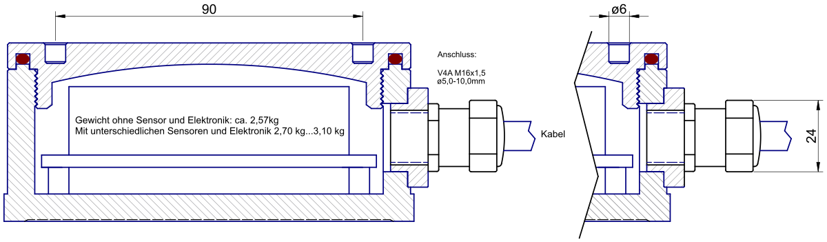 - extrastabiles, druck-, seewasser- und korrosionsbeständiges V4A-Edelstahlgehäuse