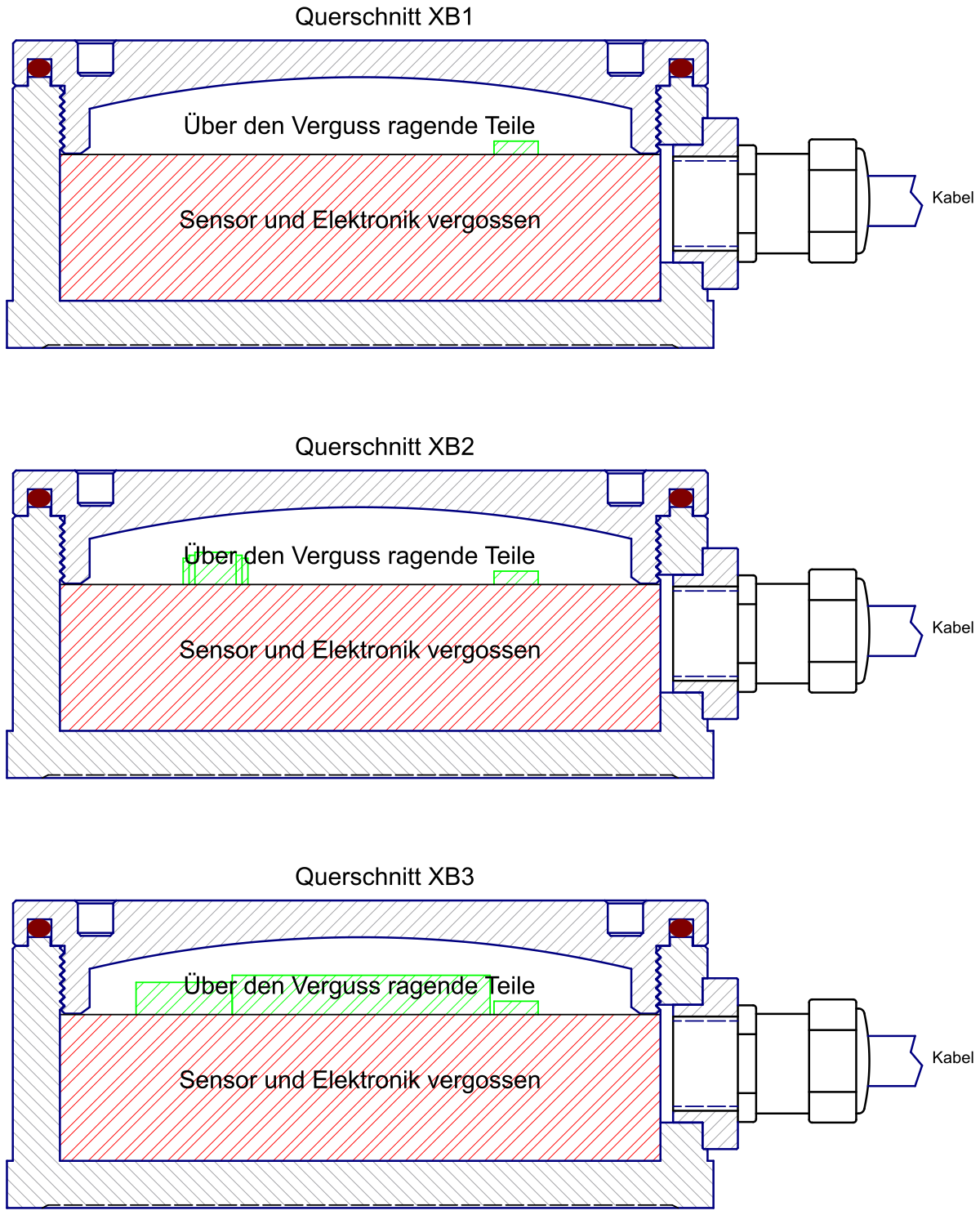 Querschnitte der XB ATEX Variante mit 1, 2 und 3 Sensoren