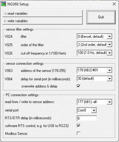 After that, invoking "read variables" returns the respective sensor's current configuration and displays the values in the corresponding boxes.