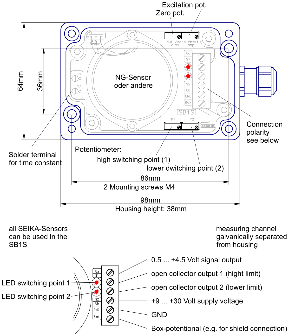 As well as the sensor, the box contains a signal conditioner with a 0.5 ... 4.5 Volt output and a separate, highly stable supply voltage that can be used externally as a reference point. Furthermore, the signal conditioner includes an active low pass filter, whole upper cut-off frequency / settling time can be tailored to suit the measurement task, and a noise voltage filter to guarantee the EMC. Interference signals caused by unwanted ground currents are eliminated by electrically isolating sensor and signal conditioner from the housing. In addition to the voltage output, the SB1S has two open-collector output switches. Two helical trim-potentiometers enable the adjusting of two trigger thresholds within the measuring range, the exceeding of which causes the corresponding output switch to trigger. Optionally, the state transition can be set to be either off to on or on to off. The switching hysteresis can be adapted to the measuring task. Unlike the SB2.., the SB1S can accommodate larger inclinometers, such as the NG-series, that have a higher measuring accuracy. Electronic temperature compensation largely compensates for the temperature drift of the implemented sensor's sensitivity. Optionally, the temperature drift of both offset and sensitivity can be reduced significantly through individual compensation.