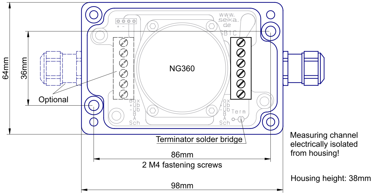 In addition to the sensor, the box contains extensive EMC protection and RS485 terminator resistance that can be de- and reconnected via a soldering bridge.