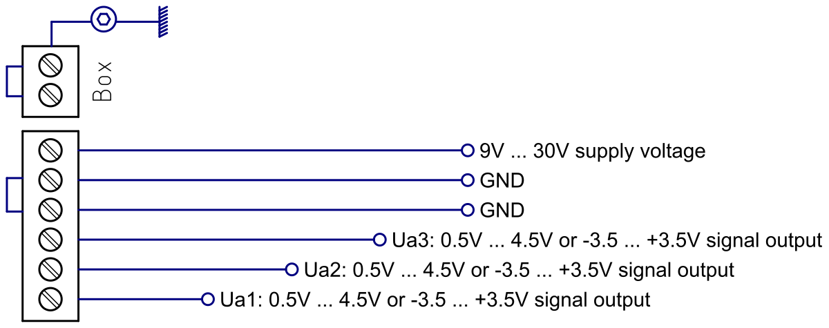 - three integrated signal conditioners with 0.5V ... 4.5V or (optional) -3.5V ... +3.5V signal output