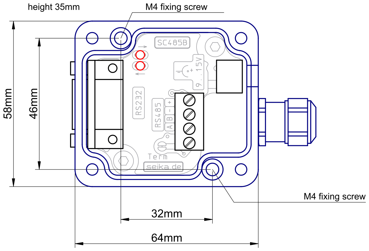 | RS485 terminals and cable gland | 4 x 1.5mm2 M12 x 1.5 metal cable gland, clamping range 3.5mm ... 5mm |